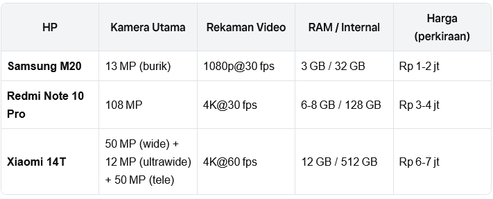 Mulailah dari Samsung M20 bila baru merintis, naik ke Redmi Note 10 Pro untuk peningkatan signifikan, atau langsung pakai Xiaomi 14T bila ingin performa setara flagship.