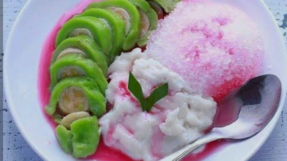 Perpaduan pisang lembut berbalut adonan hijau, bubur sumsum yang creamy, sirup merah, serta es serut menjadikan es pisang ijo sebagai salah satu kuliner tradisional Indonesia paling populer saat Ramadhan.