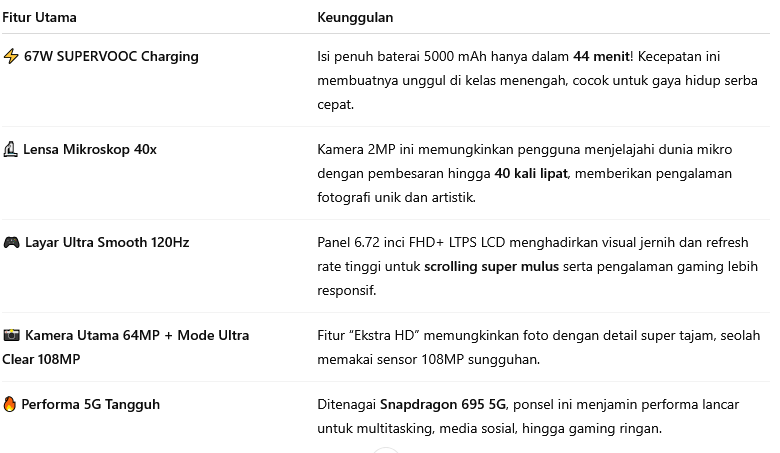 Dengan pengisian 67W SUPERVOOC, kamera mikroskop 40x, dan layar 120Hz, perangkat ini berhasil menghadirkan kombinasi performa, efisiensi, dan kreativitas yang sulit ditandingi di harga 4 jutaan.